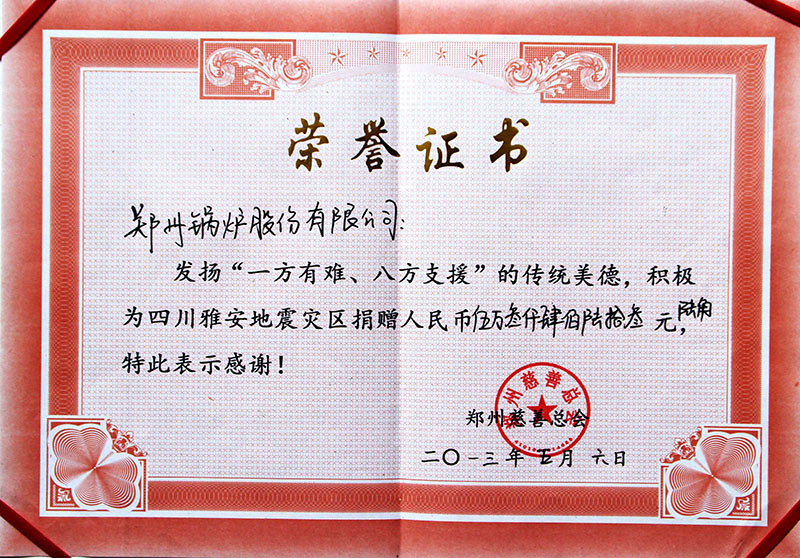 近年來,鄭鍋憑借一流的技術(shù)、過硬的產(chǎn)品、周到的服務(wù),先后榮獲河南省高新技術(shù)企業(yè)、管理先進(jìn)單位、鄭州市高成長(zhǎng)性民營(yíng)企業(yè)、鄭州市百?gòu)?qiáng)企業(yè)、五一勞動(dòng)獎(jiǎng)等多項(xiàng)榮譽(yù)。